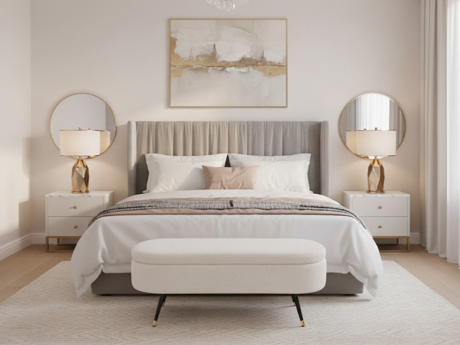 - Mėgstantiems „Glamour“ stilių. Norite miegamajam suteikti viešbučio apartamentų vertą išvaizdą? Pastatykite banketę AVEIRO lovos gale. Šis modelis su šviesiu audiniu, juodomis grakščiomis kojelėmis ir auksiniais akcentais taps ryškiausia kambario puošmena. Ant jos patogu pasidėti dekoratyvines pagalves ar chalatą, o Jūsų miegamasis akimirksniu taps elegantiškesnis.