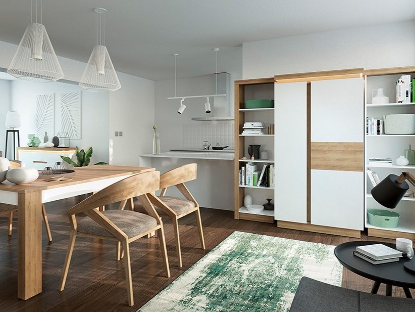 Maži kambariai ar nišos gali būti iššūkis, bet ši spinta - tikras stebuklas. Šviesus ąžuolo dekoras dera prie skandinaviško stiliaus interjero, o lentynos bei strypai pakaboms leidžia išnaudoti kiekvieną centimetrą. Maža, žaisminga, bet labai naudinga - kaip mažas genijus, kuris sutvarko viską aplink.