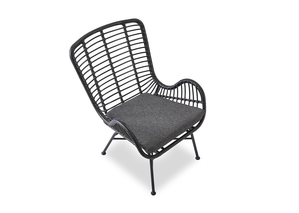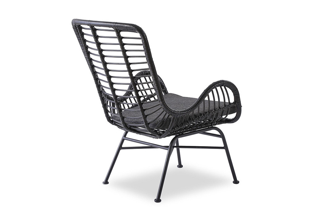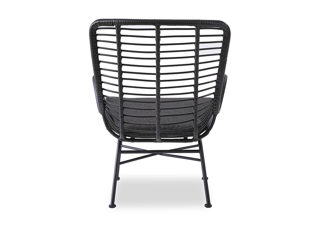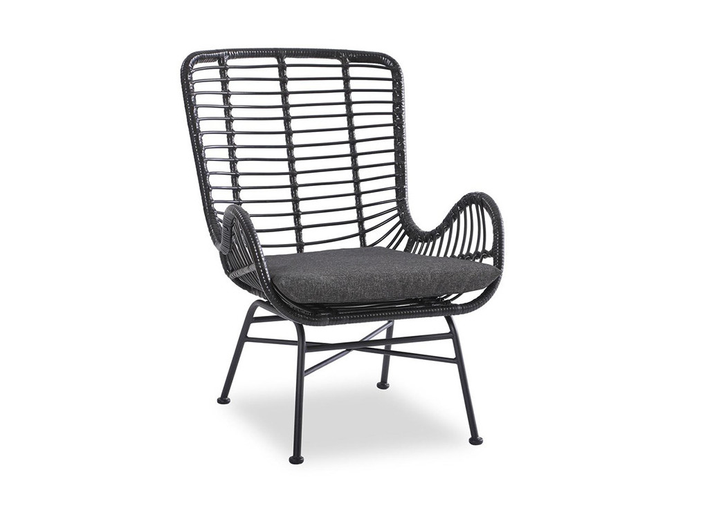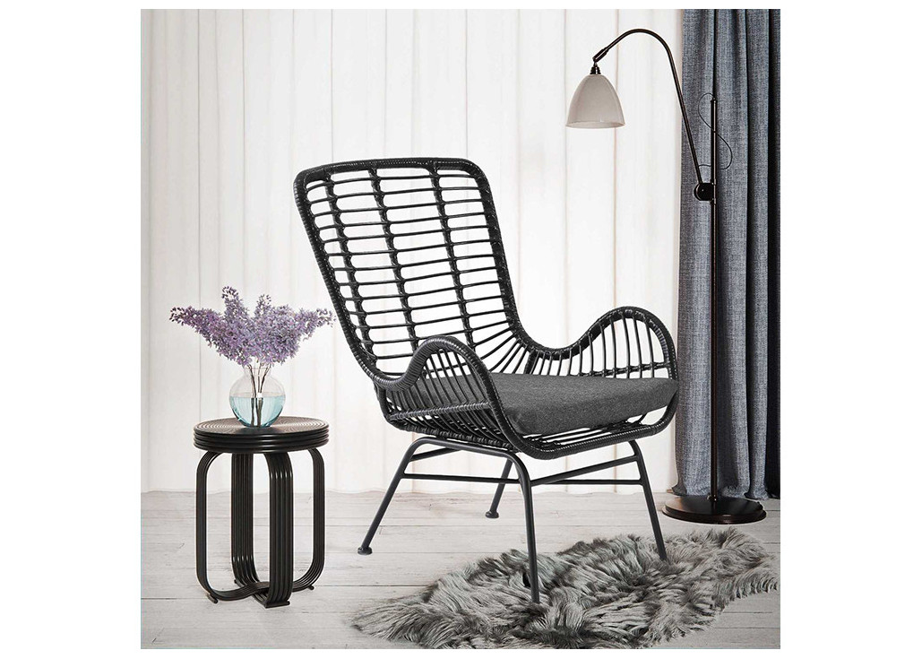 Skandinaviško dizaino subtilus juodos spalvos fotelis Ikaro 2. Fotelis pagamintas iš metalo rėmo, apsuktas ratanu.