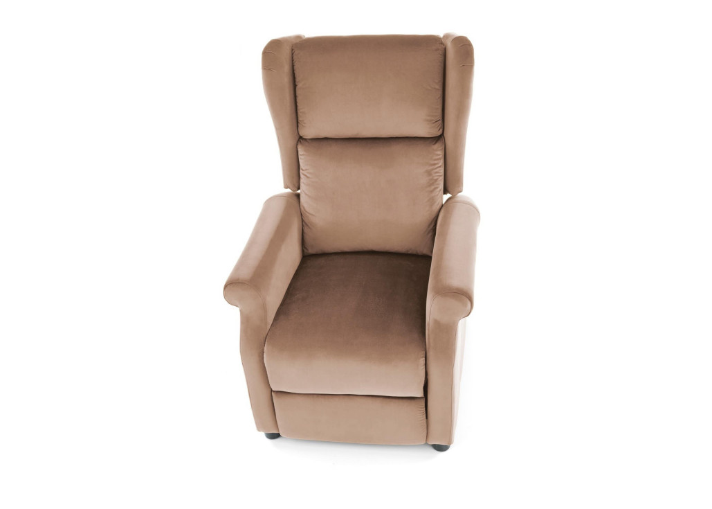 Veliūrinis smėlio spalvos fotelis reglaineris Agustin 2 su reguliuojamu nugaros atlošu ir pakeliamų kojų mechanizmu.