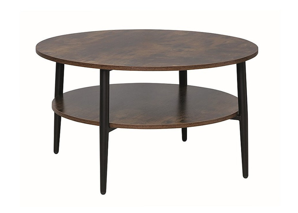 Apskritas staliuko viršus pagamintas iš sendintos medienos spalvos (rustic) laminuotos plokštės.