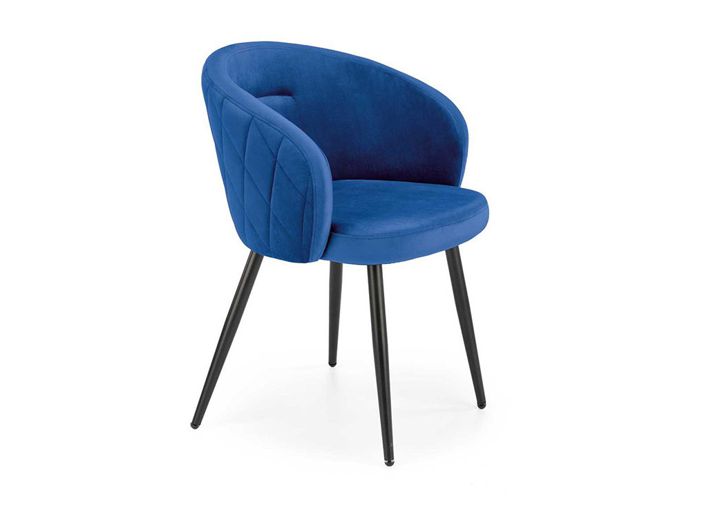 Moderni ir minkšta mėlynos spalvos kėdė K430 su metalinėmis juodomis kojelėmis. Kėdės nugarėlė dekoruota rombo formos dygsniais.