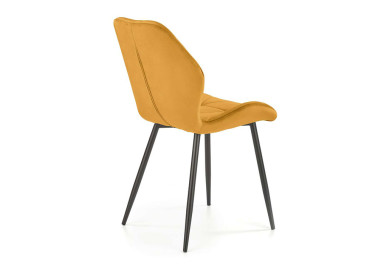 Garstyčių spalvos veliūrinė modernaus dizaino kėdė K453. Išskirtinė kėdės forma ir trikampio dygsniuoti raštai suteikia baldui unikalumo. Kėdė aptraukta kokybišku veliūriniu audiniu, o kojelės pagamintos iš milteliniu būdu dažyto metalo.