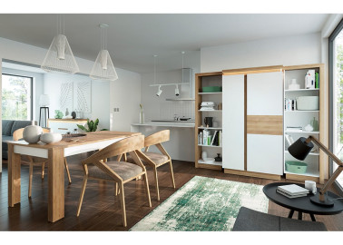 - Modernus dizainas: blizgios baltos spalvos fasadas ir šiltas Riviera ąžuolo atspalvis suteikia baldams elegancijos ir jaukumo, tobulai derėdami bet kokio stiliaus interjere.