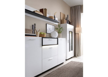 EXT-RAV baldų kolekcija išsiskiria šiuolaikišku dizainu ir subtilia prabanga. Blizgūs balti paviršiai atspindi šviesą, vizualiai praplėsdami erdvę, o kontrastingi juodi rėmeliai suteikia baldams išskirtinumo. Metalinės rankenos ir subtilus LED apšvietimas pabrėžia modernų stilių bei sukuria jaukią atmosferą.