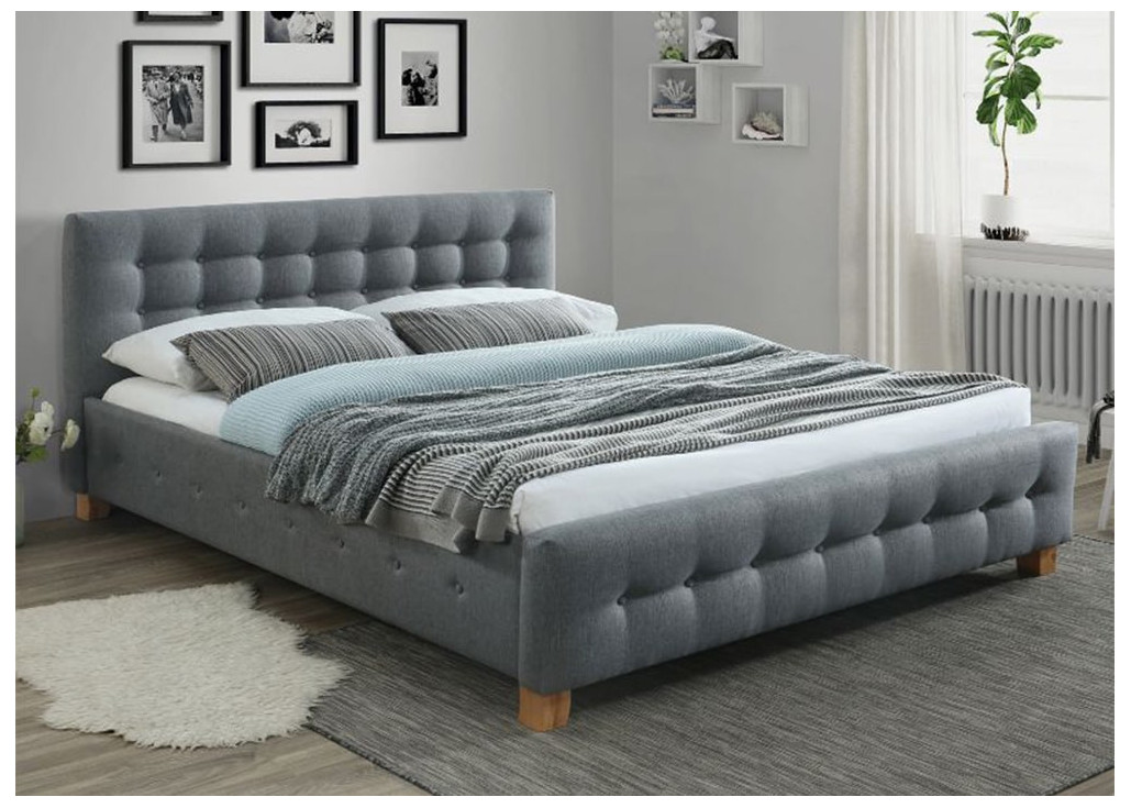 Madingos pilkos spalvos lova aptraukta patvariu ir maloniu liesti stambaus audimo gobelenu.
