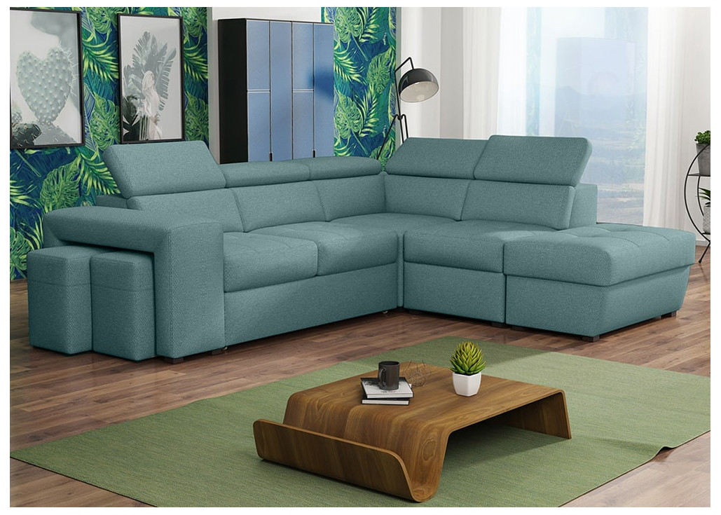 Modernus ir funkcionalus, modulinis minkštas kampas ROB-POS-MIN su reguliuojamomis galvos atramomis, plačiu porankiu bei dviem ištraukiamais pufais.