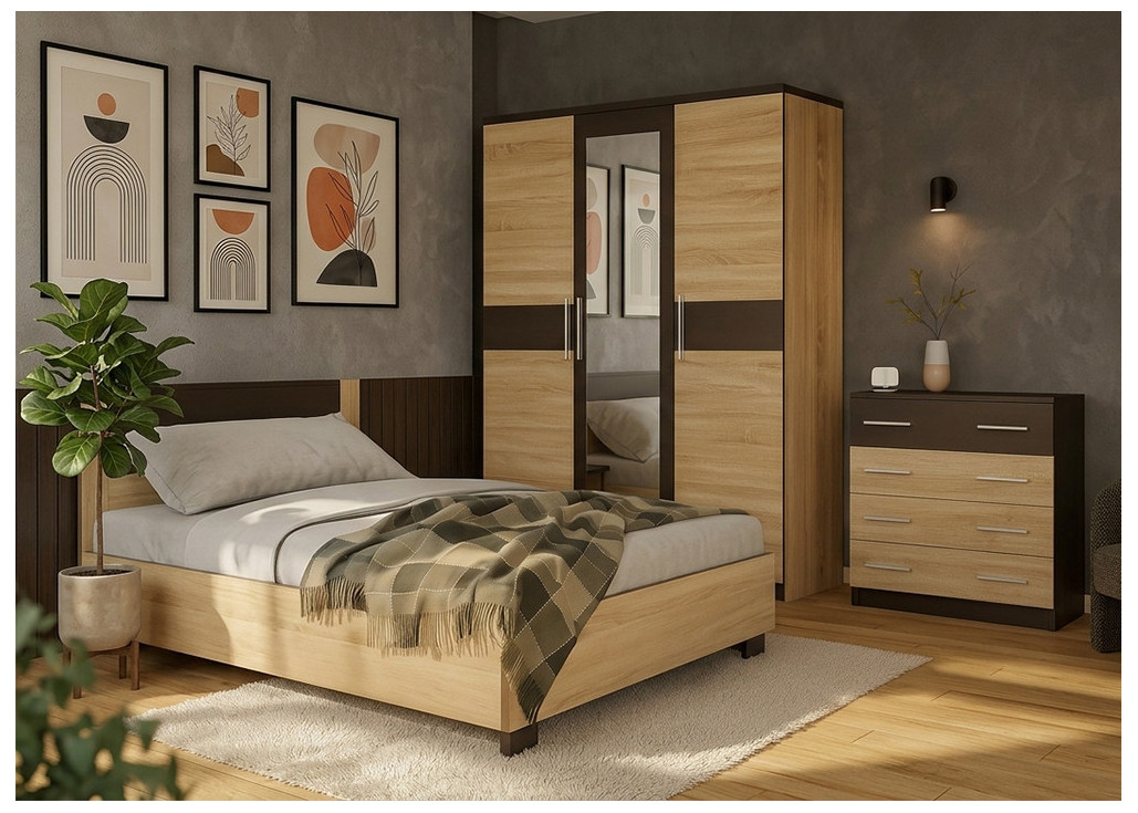 Visi šio komplekto baldai pagaminti iš dviejų medienos spalvų derinio: April ąžuolo ir tamsios venge.