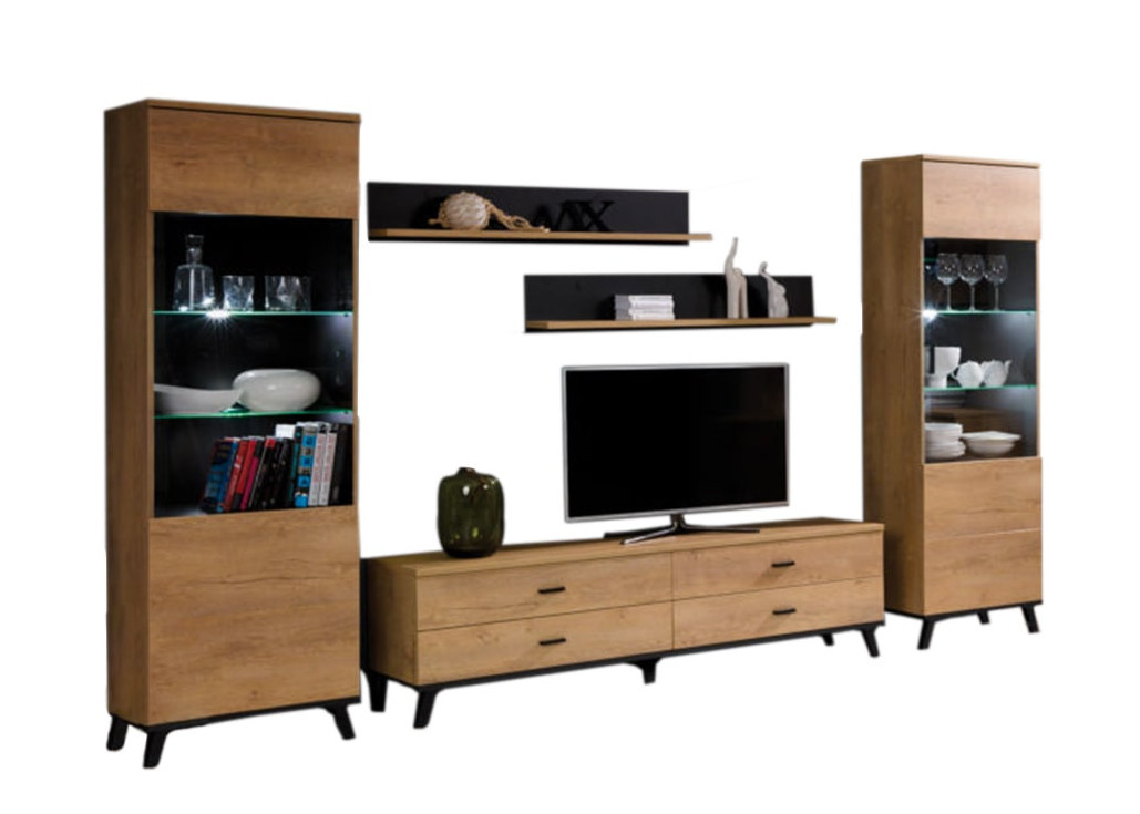 Komplektą sudaro penki elementai: dvi vitrinos, dvi lentynos ir TV spintelė.
