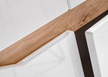 - Skandinaviškas dizainas: ąžuolo spalvos korpusai harmoningai dera su baltais blizgiais fasadais, sukurdami šilumos ir elegancijos įspūdį.