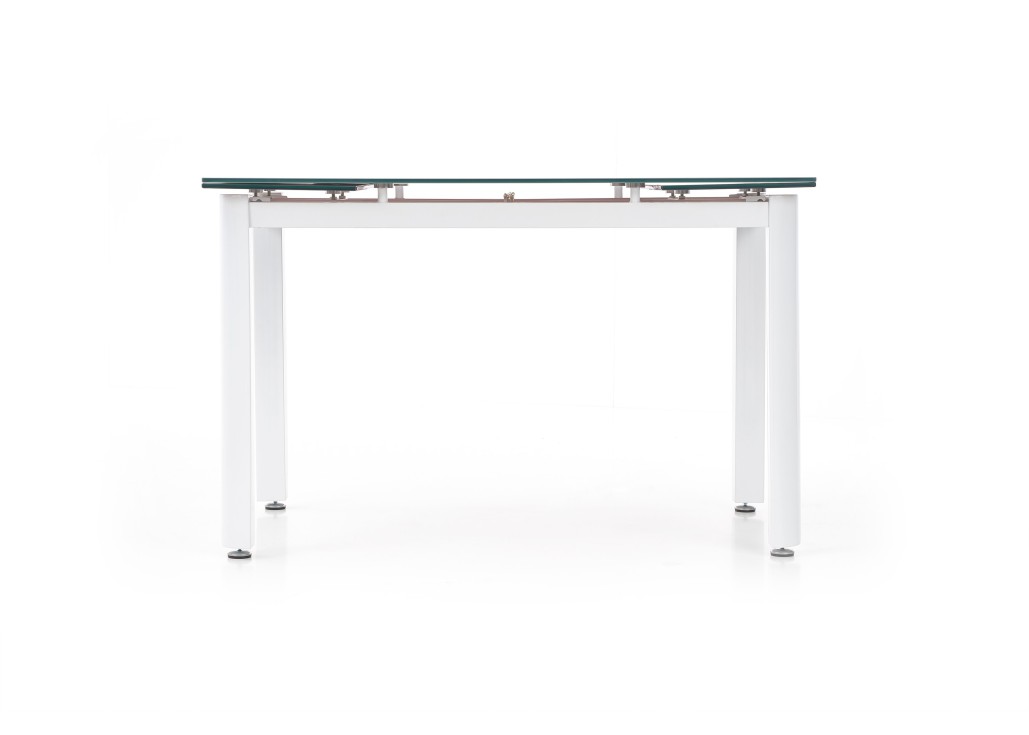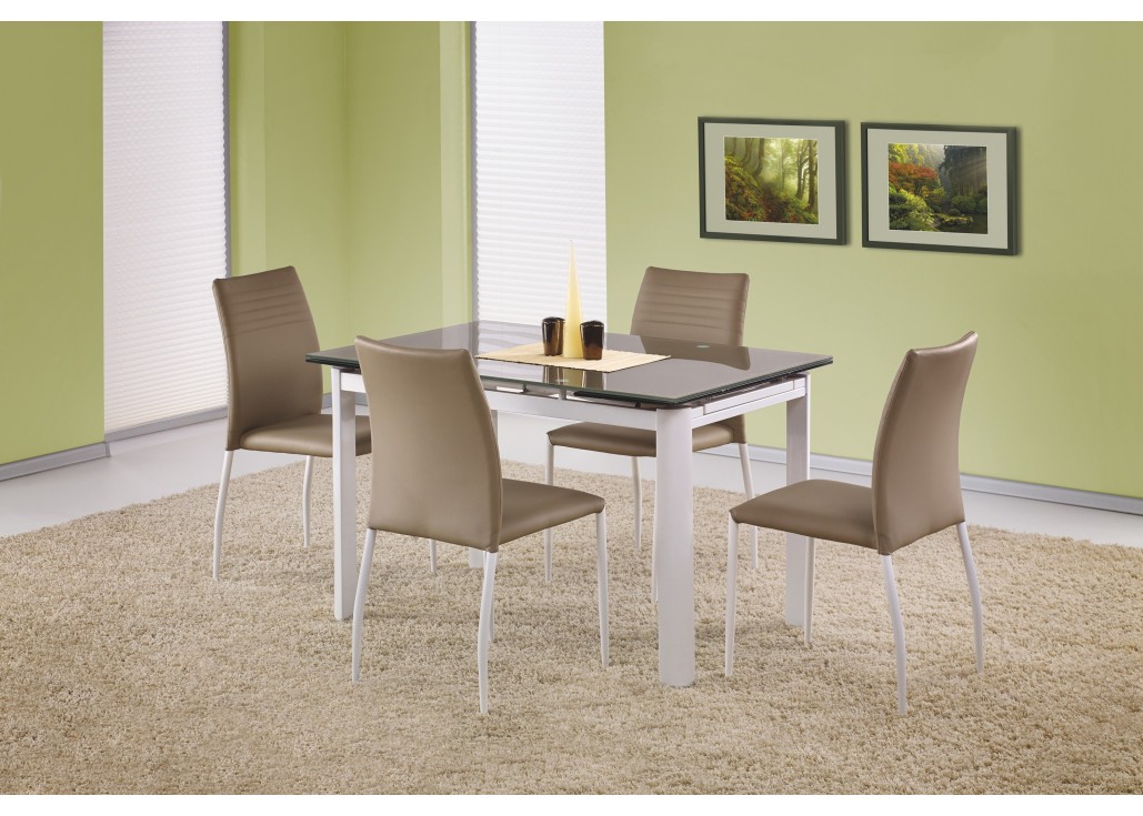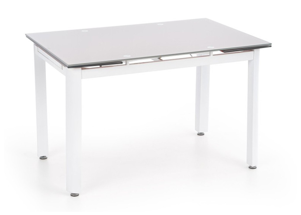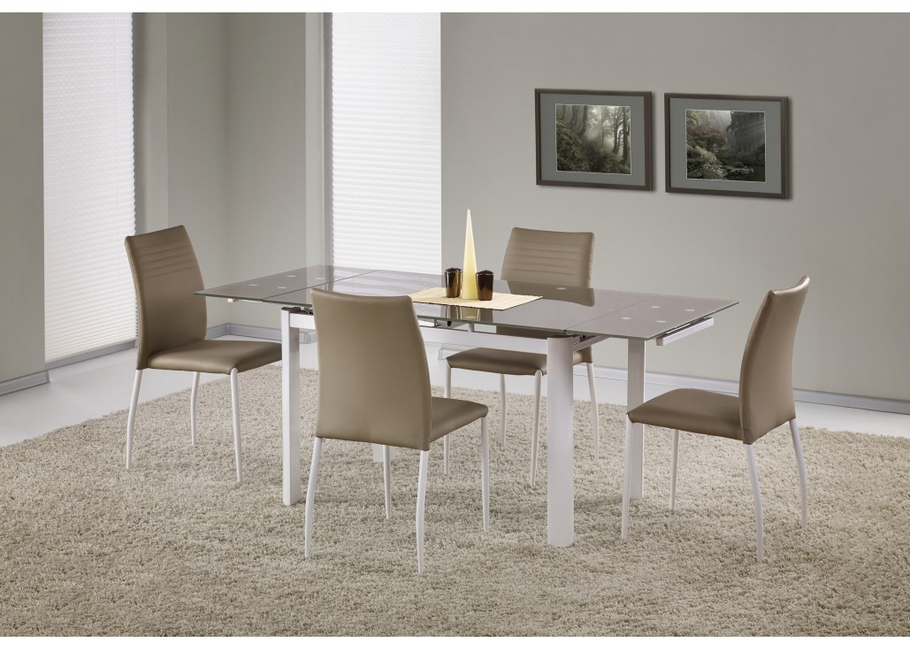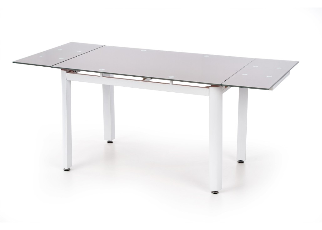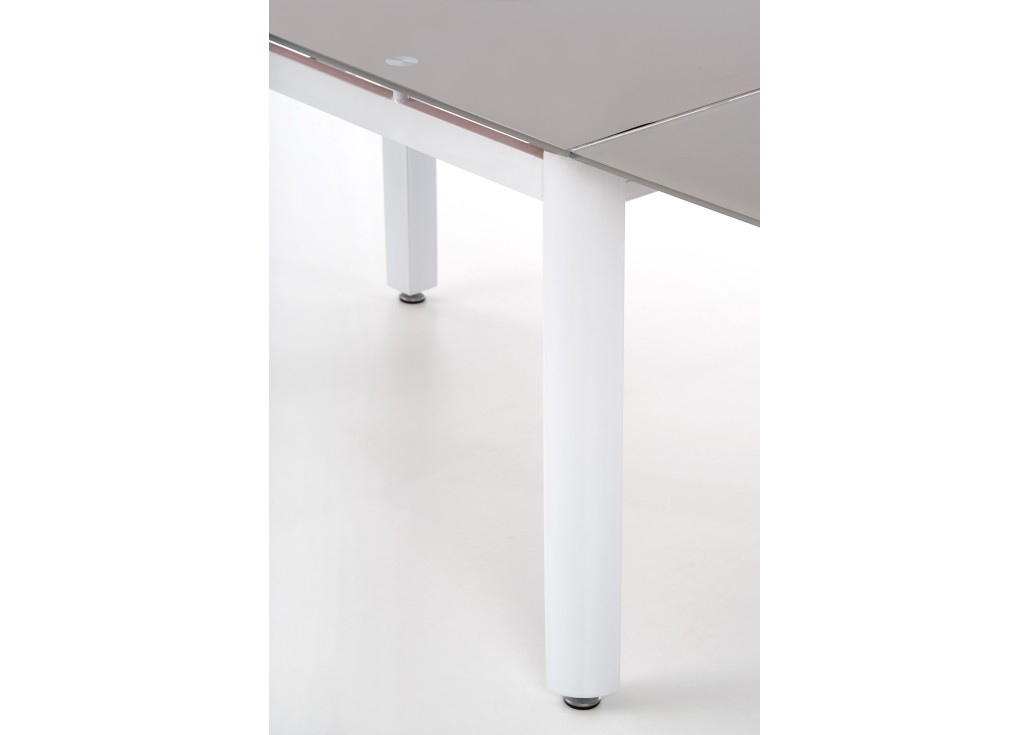Ištraukiamas valgomojo stalas su stačiakampiu stalviršiu, pagamintu iš smėlio spalvos grūdinto stiklo.