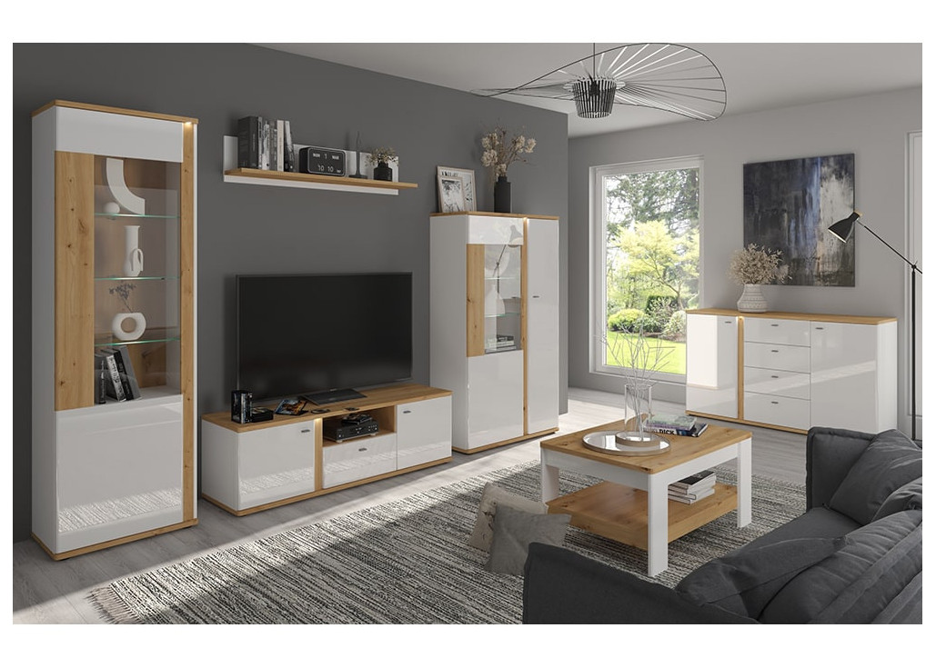 Šiuolaikiškas dizainas sujungia blizgios baltos spalvos fasadą ir Artisano ąžuolo atspalvį, suteikdamas baldui lengvumo ir jaukumo.